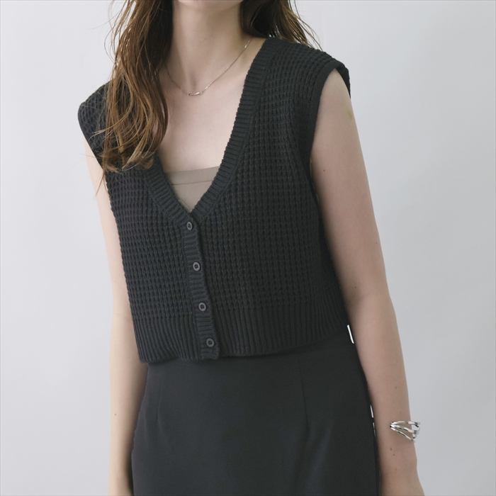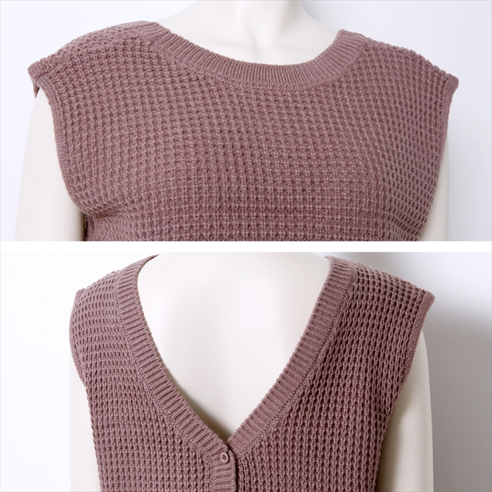 着こなしの幅を広げる前後ろで着用できる2WAYボタン付ニットベスト。