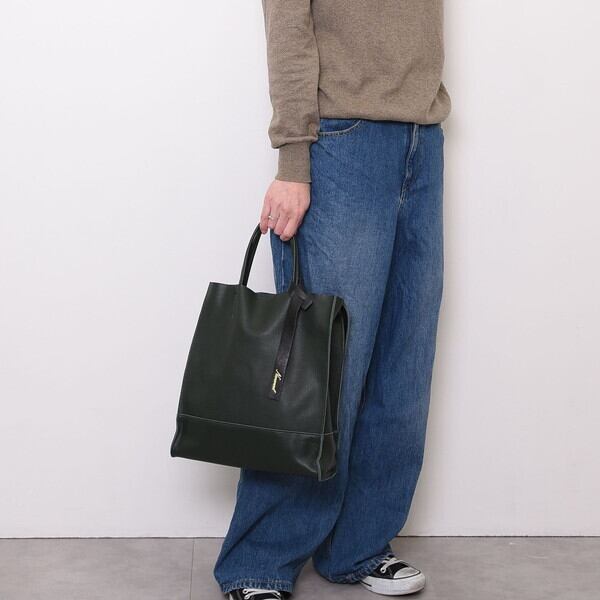 シンプルなデザインのレザー縦長トートバッグ。
