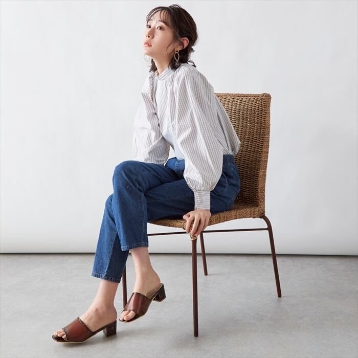 カラーのボーダートップスと合わせるのがおススメです。