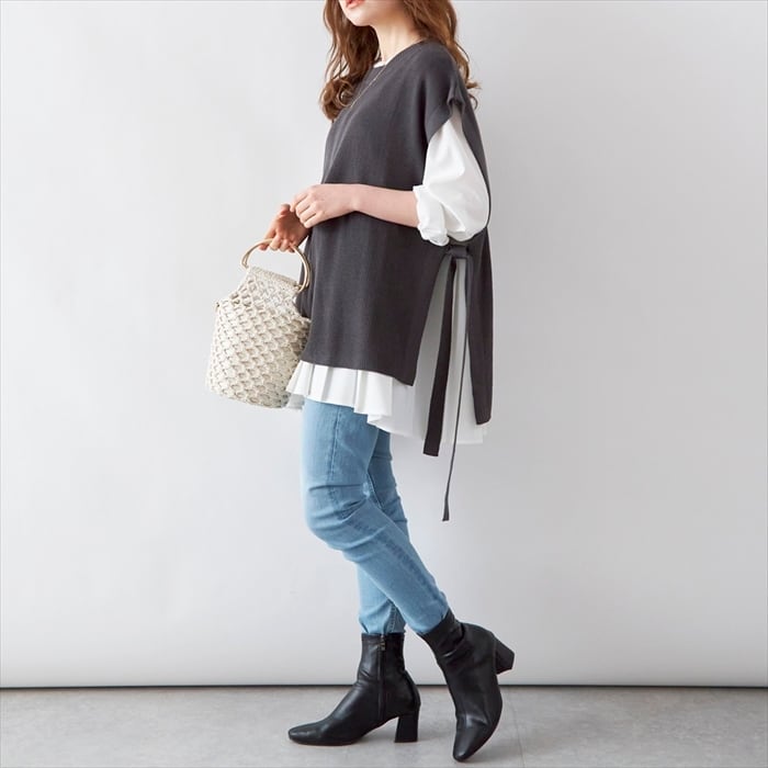 Vネック・クルーネックの選べる2typeオーバーシルエットのサイドリボンニットベスト。